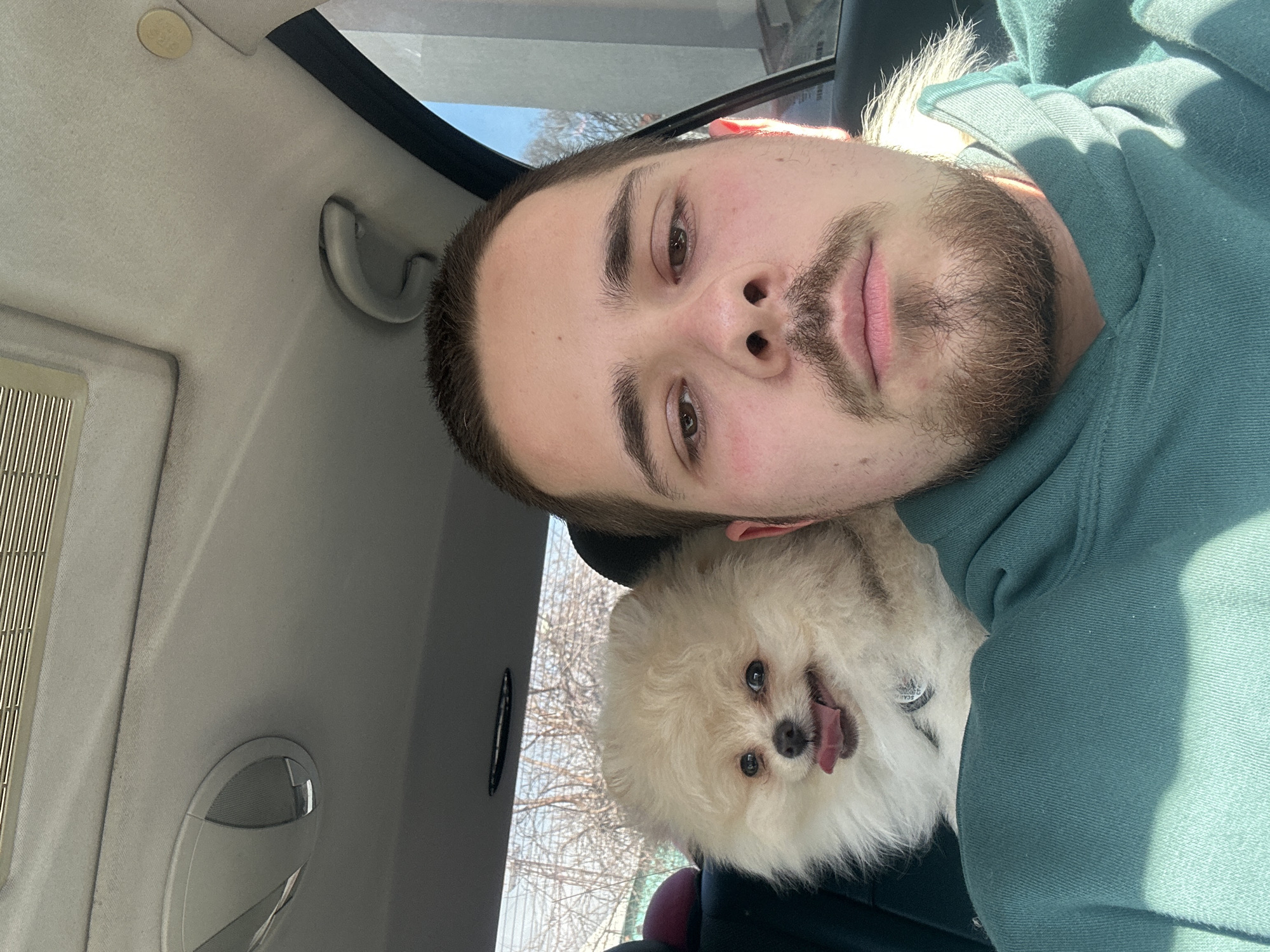 An adult male and a Pomeranian dog are seated within the passenger compartment of a vehicle, in what appears to be an outdoor setting in Varna, Bulgaria, though a specific location within the city cannot be precisely identified from the image. The male, positioned in the foreground, has short dark hair, a beard, and a mustache. His cheeks exhibit a reddish flush. He is wearing a teal-colored hooded sweatshirt and is looking directly towards the camera, suggesting he is taking a selfie. Behind and slightly to the left of the male, a fluffy, cream-colored Pomeranian dog is visible, its head and upper body appearing over the male's left shoulder. The dog has dark eyes, a black nose, and its pink tongue is slightly extended from its mouth, giving an impression of panting or a smile. A dark collar with a circular tag is visible around the dog's neck. The interior of the vehicle features a light grey headliner with overhead ventilation grates and an oval-shaped dome light fixture. Sunlight streams into the vehicle from the right side, illuminating the right side of the male's face and the dog. Through the rear window, bare deciduous trees and portions of a distant structure are visible. A segment of clear blue sky and a bright, indistinct structure are visible through the passenger side window.