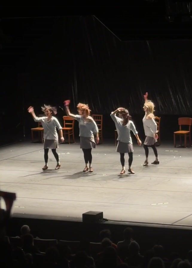 four dancers on a stage with wooden chairs in the background, performing for an audience
