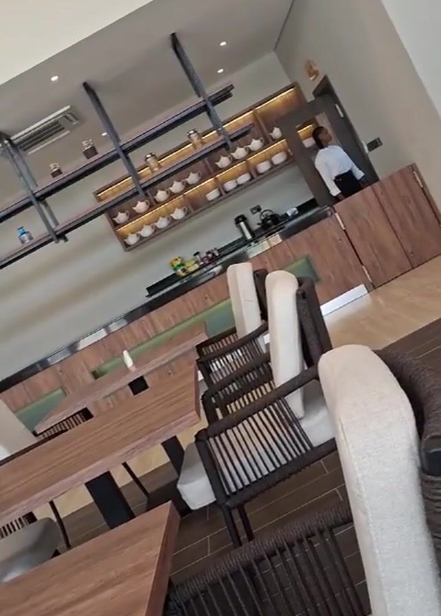 interior of a restaurant or cafe. The camera tilts upwards, revealing a ceiling decorated with woven baskets and recessed lighting. The space features wooden tables and chairs with light-colored cushions. In the background, shelves are stocked with teapots and cups, and a person in a white shirt stands near a wooden counter. The overall ambiance is modern and subtly decorated.