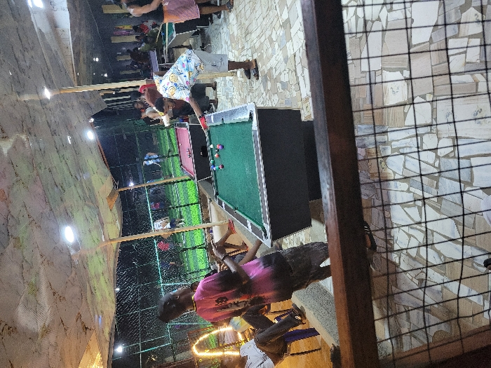A sideways shot shows an outdoor recreation area with a pool table centrally located. One man stands near the pool table, wearing colorful clothing. Another pool table is visible in the background, along with people standing and walking. A fence is nearby. The lighting is dim, suggesting it might be nighttime.