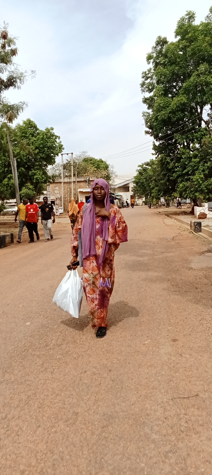 The scene depicts a daytime street in Kabala, Nigeria. A woman of dark complexion is positioned centrally in the foreground, walking towards the viewer. She wears a long, loose-fitting garment patterned in orange, red, and cream, with a light purple headscarf draped over her head and shoulders. Her left hand holds a white plastic bag, and her right hand rests near her upper chest. She is wearing dark sandals. In the mid-ground to the left, three men walk away from the camera. The man on the far left wears a yellow shirt and dark trousers; the middle man wears a red t-shirt with a white graphic and dark trousers; the man on the right wears a black t-shirt and light-colored trousers. Further down the street, other indistinct figures are visible. The ground surface is an unpaved or gravel road, reddish-brown in color. Mature green trees with dense foliage line both sides of the thoroughfare. Utility poles are visible on the left side of the street, and power lines traverse the upper mid-ground. A light-colored building with a stone-like texture is visible on the left, beyond the group of men. Concrete bollards or barriers are present along the right edge of the road. The sky is overcast with light cloud cover.
