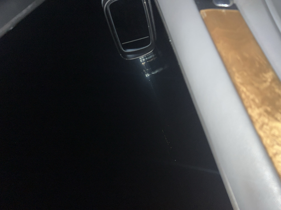 The scene depicts a nighttime view from the interior of a vehicle, located in or around the city of Montana, Bulgaria. The lower portion of a light-colored car door, featuring a horizontal light brown wooden trim panel, occupies the bottom third of the frame. On the right, a rectangular, metallic-framed side-view mirror is visible, partially reflecting the distant lights. Outside the vehicle, the environment is dominated by a vast, dark body of water under a black night sky. Numerous small, faint lights are scattered across the distant water surface on the left side of the frame. On the right, a linear arrangement of brighter, distinct lights, consistent with a bridge, pier, or illuminated shoreline, is clearly reflected in the calm water, extending towards the horizon. No individuals, specific actions, or direct interactions are visible.
