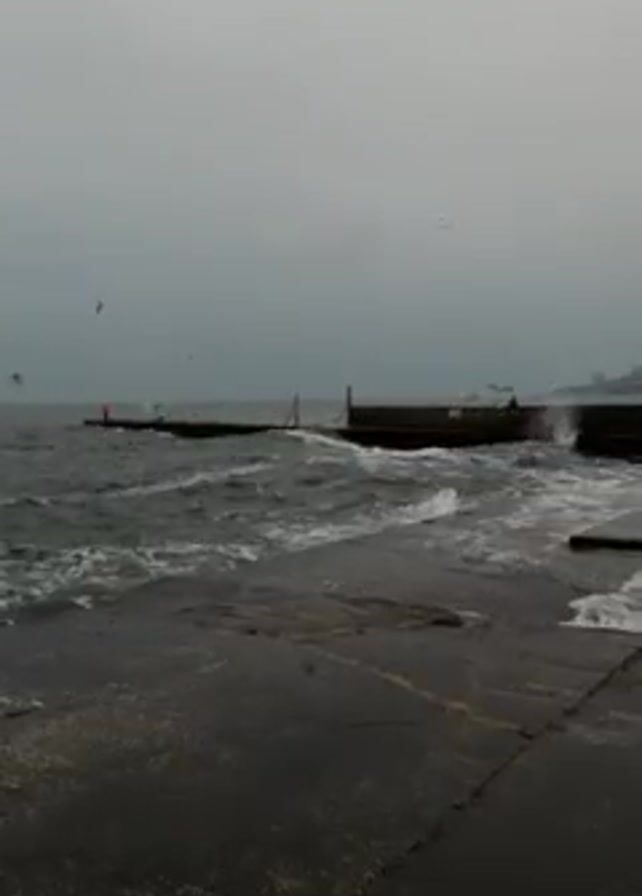 gray, overcast day at a beach with rough water. Waves crash against a dark, concrete pier and the foreground stone surface. Seagulls are flying around in the sky and over the water. A person wearing a red jacket stands on the end of the pier. The city skyline is visible in the far distance.