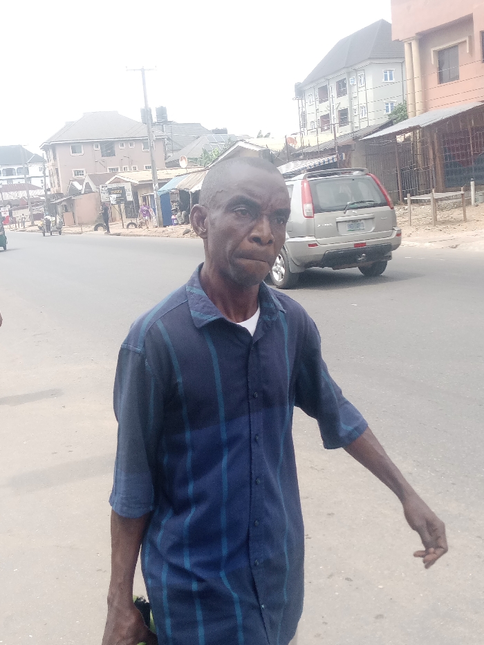 The image depicts an urban street scene in Aba, Abia State, Nigeria, during daylight hours. In the foreground, a dark-skinned adult male, appearing middle-aged, stands or walks on an asphalt road, facing slightly towards the camera. He has short, faded hair, and is wearing a navy blue short-sleeved collared shirt with vertical lighter blue stripes over a white undershirt. His right hand holds a dark object at waist level, while his left arm hangs loosely. In the mid-ground, a silver Nissan X-Trail SUV is visible on the right side of the road, positioned with its rear facing away from the viewer. A Nigerian license plate, partially obscured but showing "ABD 44", is affixed to the vehicle. The background features various buildings lining both sides of the street. On the left, several multi-story buildings with dark brown roofs are present, along with smaller, informal market stalls constructed with corrugated metal roofs. A utility pole with overhead wires is visible, and a sign for "PALM ... PARADISE" is partially legible on one of the structures. Further down the street, other individuals are discernible, along with a light-colored tricycle. The road surface is paved asphalt, and the overall lighting is bright, suggesting clear daylight conditions.