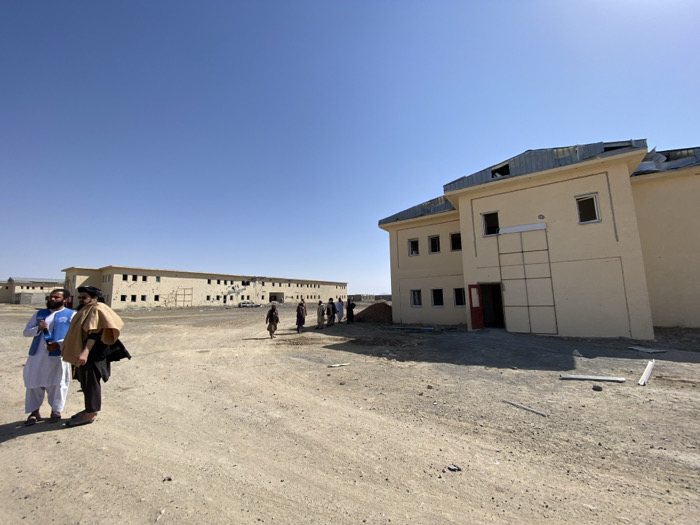 The image depicts an arid outdoor environment in Bar Mel, Afghanistan, under a clear blue sky. The ground is dry, uneven dirt and gravel, with scattered debris near the foreground structure. In the immediate foreground, two men stand. The man on the left wears a white shalwar kameez, a dark vest, and a light turban, holding a blue object. The man on the right wears dark clothing with a tan cloak draped over his shoulders and a dark turban. To the right, a two-story cream-colored building with a partially damaged corrugated metal roof is visible. The roof shows lifted and possibly missing sections. The building's facade features multiple rectangular window openings, some lacking glass, and a red entrance door. A large, grid-patterned panel is affixed to the wall adjacent to the entrance. In the mid-ground, stretching horizontally, is a longer, lighter-colored building, also with a corrugated metal roof and numerous rectangular openings, some exhibiting dark marks consistent with damage. A group of approximately six individuals, dressed in dark traditional attire, walks on the dirt path between the buildings, moving away from the viewer towards the longer structure.