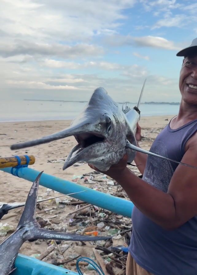 A man on a beach displays a large, silvery fish. The man, wearing a blue tank top and grey cap, stands next to a boat with blue trim. He smiles as he holds the fish. The fish has a long, pointed snout and prominent eye. The beach has trash scattered around and the sky is cloudy.