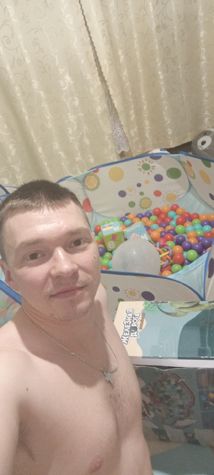 A bare-chested male individual with short dark hair and light complexion is depicted in a selfie, looking directly at the camera. He wears a silver chain with a pendant around his neck. The setting is indoors, in what appears to be a domestic environment within the city of Марковский, Russia. Behind and to the right of the individual, a fabric ball pit is observed, featuring a light-colored interior with multicolored polka dots and blue trim. The ball pit is filled with numerous plastic balls in red, orange, green, blue, purple, and yellow. Inside the ball pit, additional items include a large, translucent white spherical object, several small, colorful interlocking toys, and two square blocks with imagery. Below the ball pit, a light blue box with "ЖЕЛЕЗНАЯ ДОРОГА" text and a dinosaur graphic is partially visible. In the upper right corner, a grey stuffed animal is partially obscured. The background features light-colored curtains with a subtle pattern.