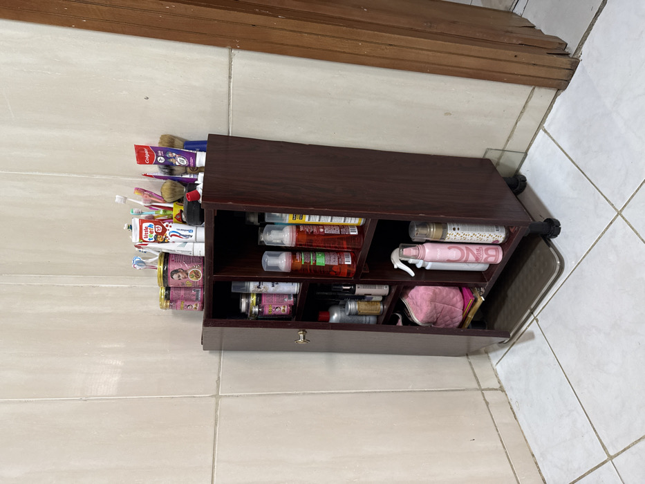 This image captures an indoor scene, likely a bathroom or personal care area, within the city of Alaguntan, Nigeria