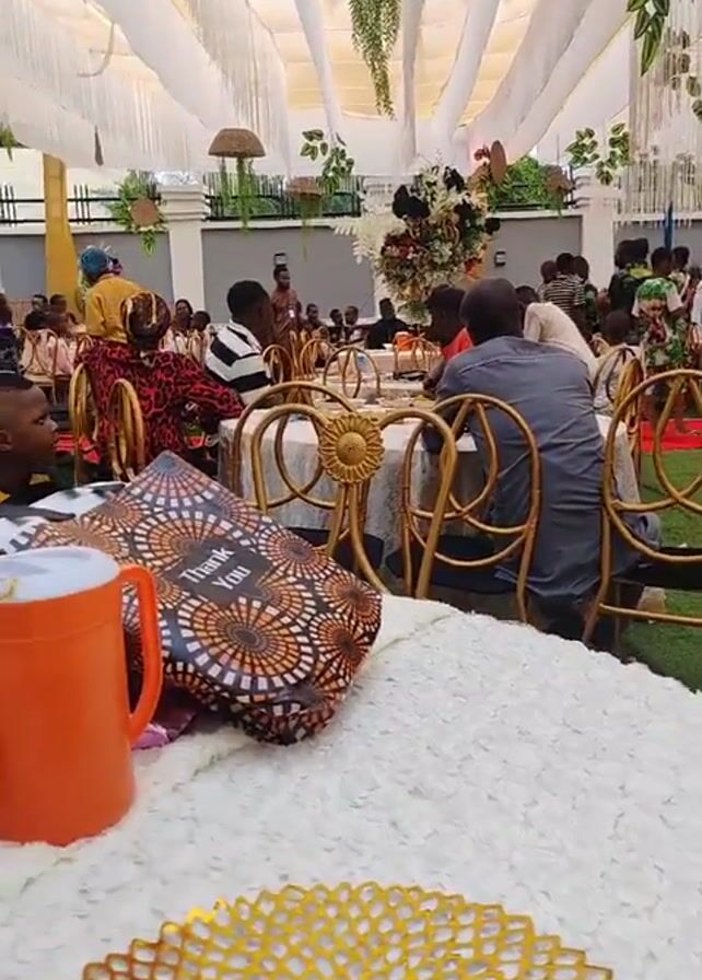 lively outdoor wedding reception. People are seated at tables decorated with white tablecloths and gold placemats. The chairs are also gold. A man and a young boy are eating from bowls at one of the tables. There are several buckets and a pitcher on the tables. The tented ceiling is draped with white fabric and decorated with hanging greenery. Music is playing in the background.