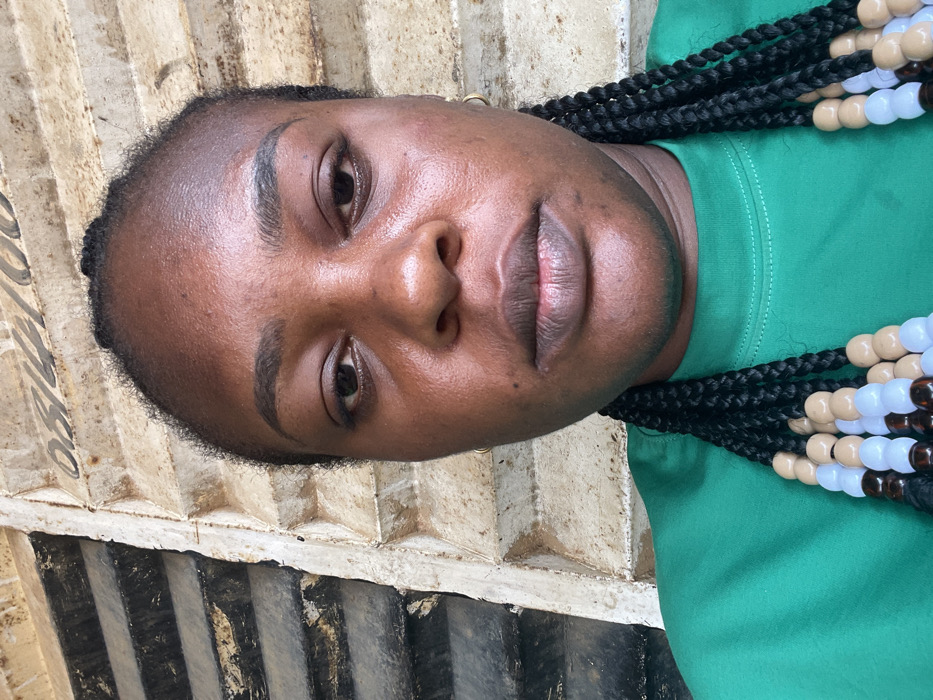 A close-up portrait, situated in Lagos, Nigeria, displays an adult Black female looking directly into the camera with a neutral expression. Her dark hair is styled in tightly pulled-back braids, with several long, beaded braids featuring light blue, beige, and dark brown beads resting on her shoulders and chest. She is dressed in a plain, bright green crew-neck top and wears small gold hoop earrings in both ears. Her skin is dark-toned, showing natural texture and a slight sheen on the forehead. The background consists of a vertically ridged or corrugated wall, exhibiting a faded beige color with areas of dark, irregular discoloration. Faint, dark numbers, specifically "0814" followed by additional digits, are partially visible on the upper right portion of the wall structure.