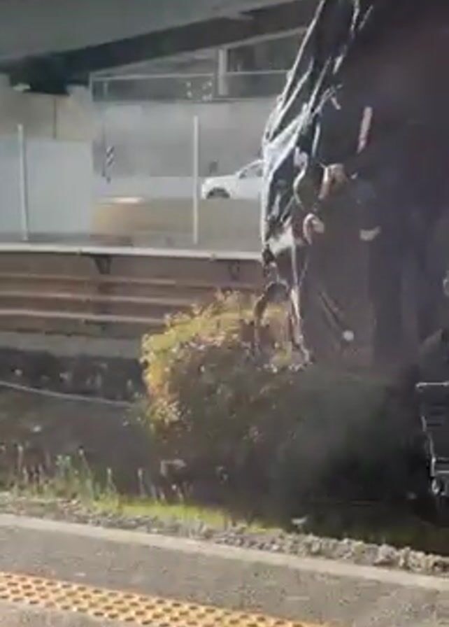 A person with blonde hair wearing a brown t-shirt, black shorts, and black socks walks along a sidewalk. They have a large black backpack on and carry a pair of sunglasses in their hand. The sidewalk is made of gray concrete and has a row of yellow tactile paving. In the background is a building and a blurred out structure, likely a bridge or other public works structure.