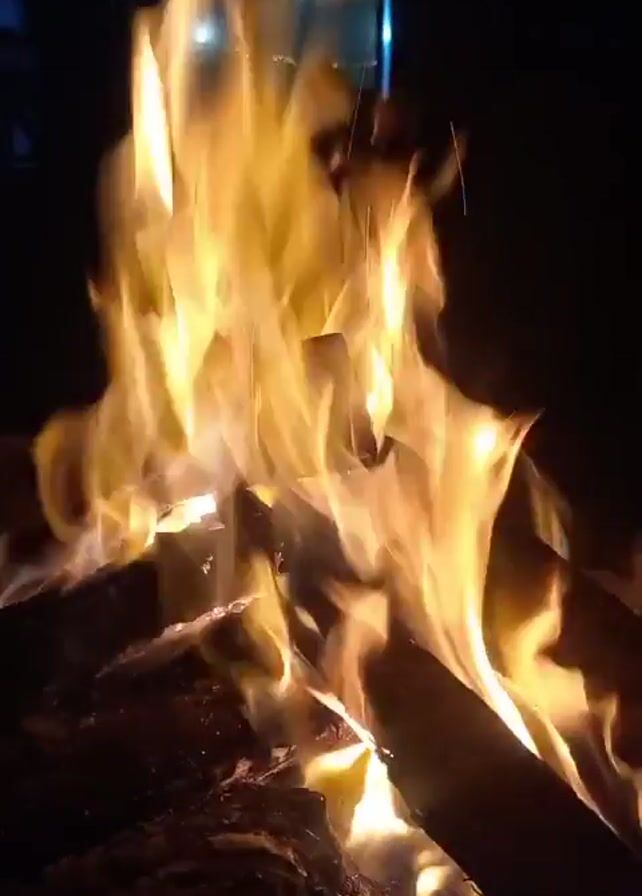 A close-up shot depicts a campfire burning vigorously in the dark. The flames are bright yellow and orange, reaching high above the logs and burning debris. The logs underneath are dark and partially consumed by the fire. In the background, there are faint strings of lights, suggesting an outdoor setting, and possibly a window emitting light. The camera is stable, offering a clear view of the fire’s movements and textures.