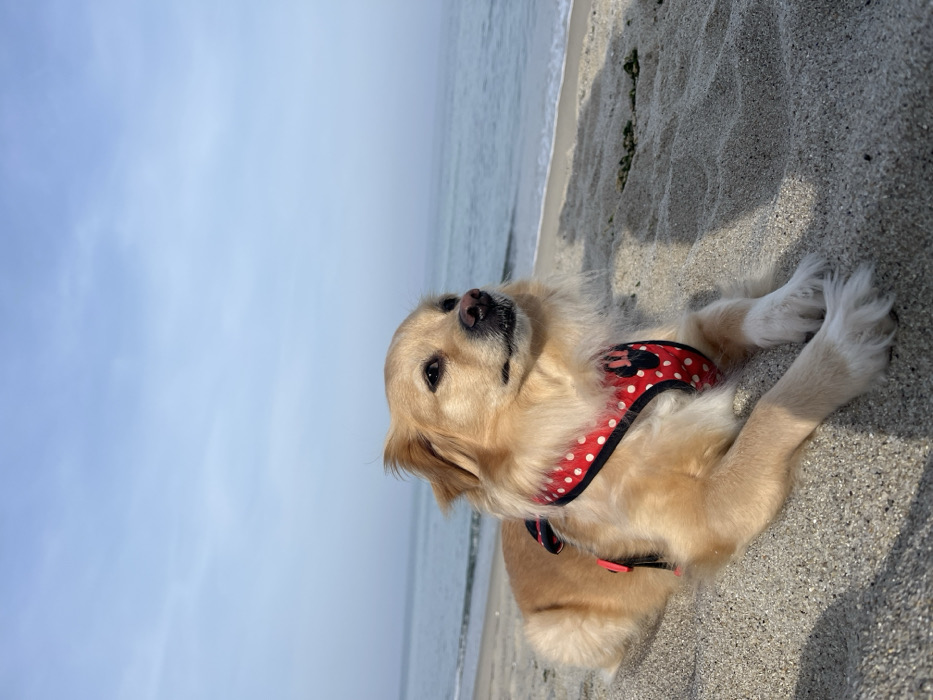 - "A light-colored dog, likely a Golden Retriever or similar mix, is depicted lying on a sandy beach under a clear, pale blue sky" by FM-m1kZq2, licensed under CC BY 4.0