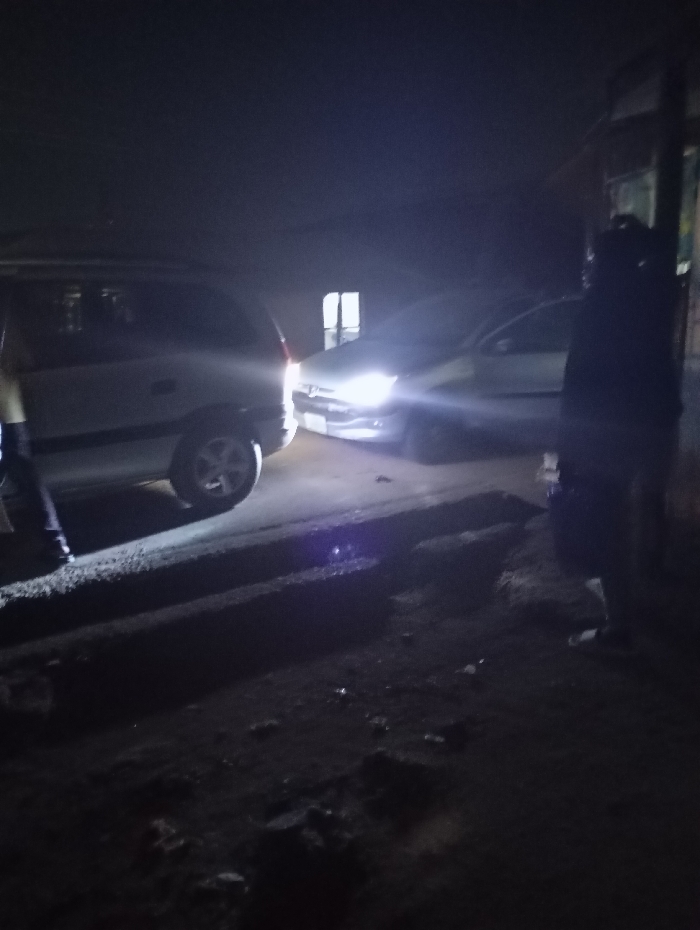 At night in Jos, Nigeria, two light-colored vehicles are stationary on an unpaved road