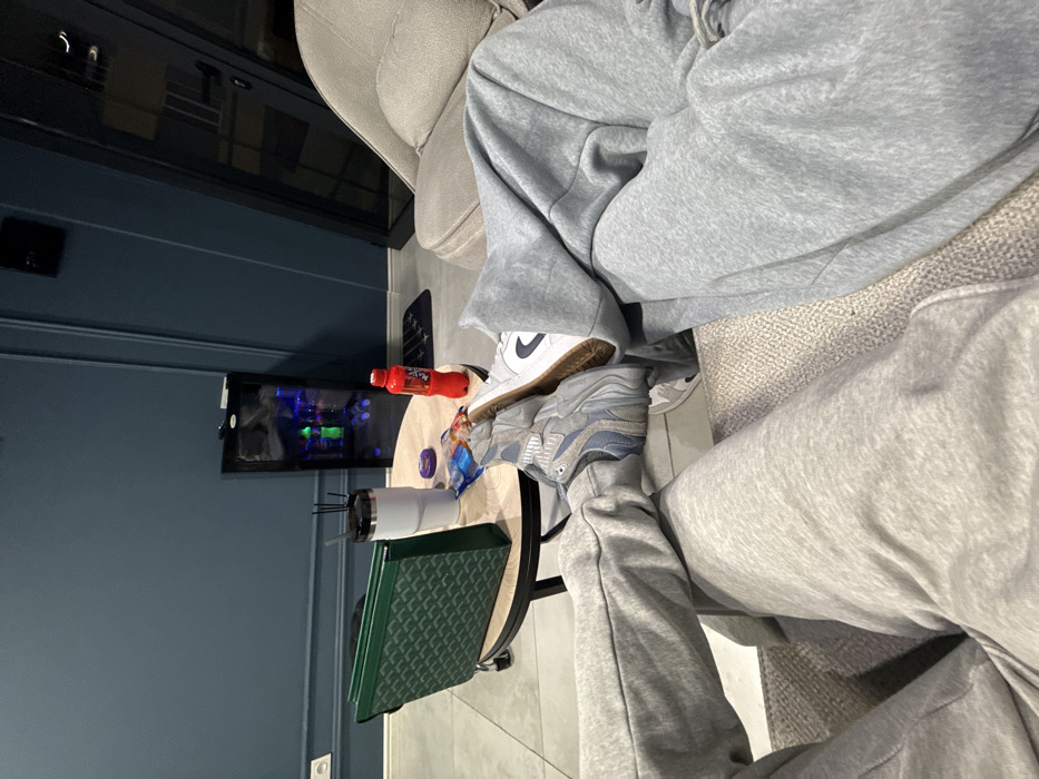 The image displays an indoor scene, likely a lounge or casual waiting area, from a low perspective. The primary subjects are the lower halves of two individuals, both wearing grey sweatpants, seated on a light-colored, textured sofa or chairs. The person on the left wears light blue and grey athletic sneakers, while the person on the right wears white sneakers with a dark swoosh logo and a brown gum sole, with their right foot resting casually on a small, dark round coffee table positioned between them. The coffee table holds a dark green patterned clutch bag standing upright, a white insulated tumbler containing multiple straws, a small purple packet, a crumpled plastic bag with snacks, and a red Fanta bottle with a white cap. In the background, a dark teal or navy blue wall with decorative molding is visible. Against this wall, a small, dark mini-fridge with internal blue and green illumination showcasing bottles stands on a dark patterned mat. To the far right, part of a light-toned upholstered armchair and a large dark glass panel or door are present. The floor is a light, possibly tiled or concrete, surface. The specific location within the city of Yerevan, Armenia, cannot be determined from the visual content provided.