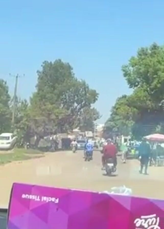 The video is taken from inside a vehicle driving down a road with trees and people on both sides