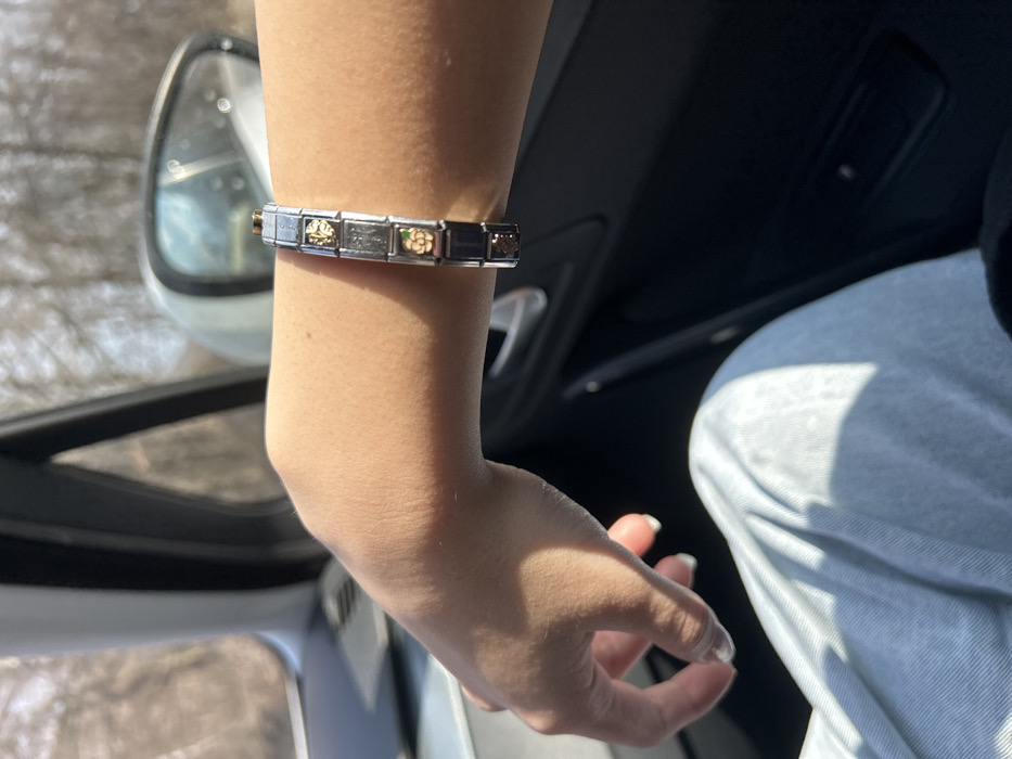 The scene depicts the right forearm and upper leg of an individual situated within the passenger compartment of a vehicle, located in Barziya, Bulgaria. The forearm is adorned with a silver-toned modular charm bracelet featuring multiple distinct links, including a gold-colored rose, a gold-colored tree emblem, and a link with a green accent. Direct sunlight illuminates the skin, highlighting visible hair follicles, and casts defined shadows across the arm and the light blue denim-like fabric covering the individual's upper leg. Through the vehicle's window and side mirror, a blurred outdoor environment consisting primarily of bare trees and foliage is visible under bright conditions, indicating the vehicle is either in motion or parked outdoors. Interior vehicle components visible include a dark-colored door panel and a light-colored window frame.