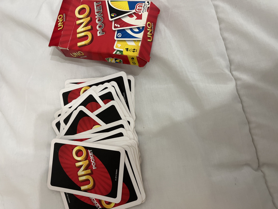 A red and yellow "UNO Pocket" card game box is partially opened, revealing a glimpse of the game cards inside