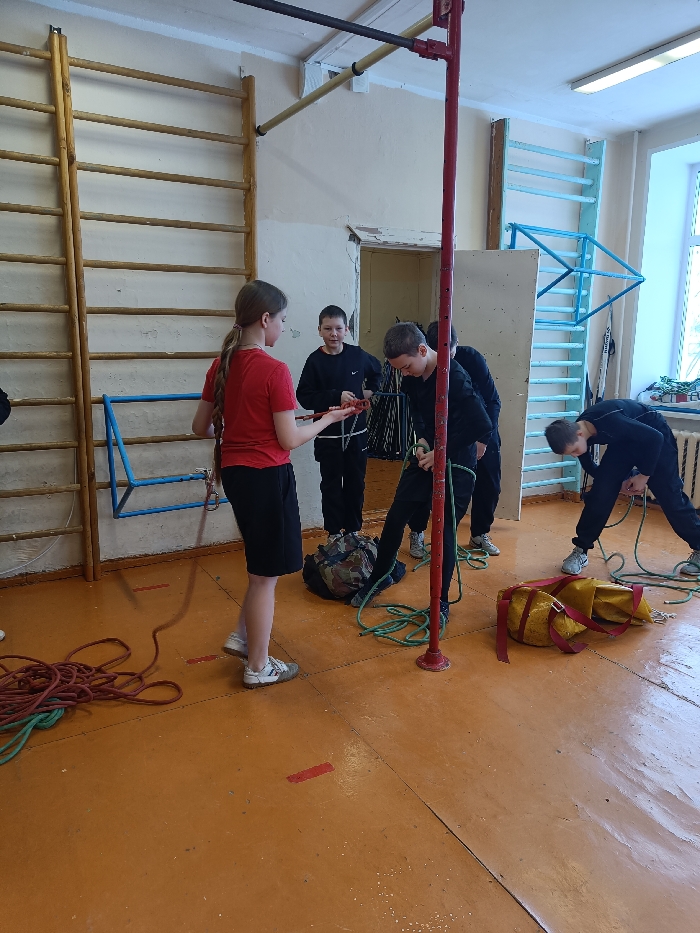 In a gymnasium, a small group of children are gathered around a red support post, handling ropes. One girl in a red shirt faces away from the camera, holding a loop of rope. Other children, dressed in dark clothing, are focused on manipulating the ropes. A yellow duffel bag and a camouflage backpack sit on the floor amidst the ropes. The gym features wall-mounted ladders and a climbing frame, with a window visible in the background.