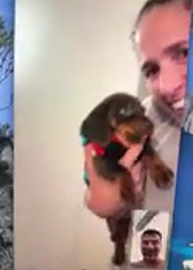 On a computer screen, two people are video chatting. One person holds up a small, brown dachshund puppy wearing a black and red outfit. The puppy is mostly still and looks up at the person holding it. The person holding the puppy looks at the camera and smiles. The other person in the video chat is also smiling. Behind the person holding the puppy, a vase of flowers and a decorative object are visible.
