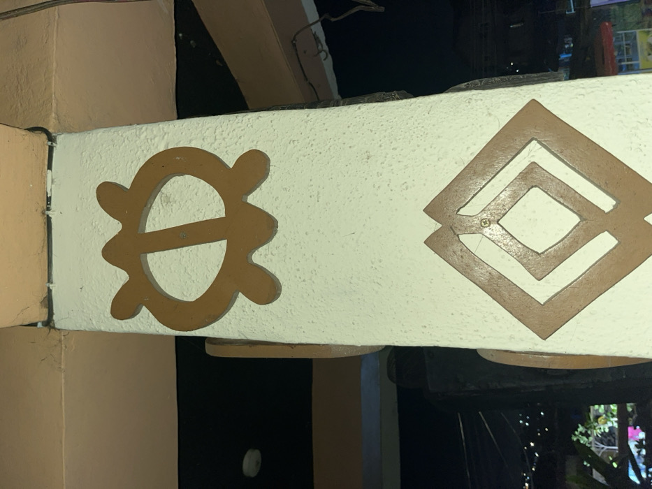 Two Adinkra symbols are affixed to a textured, cream-colored beam