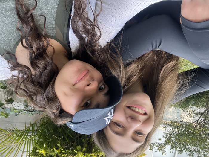 Two young women pose for a selfie outside. The woman on the left has long, curly brown hair, an olive complexion, and wears a baseball cap with a visible "NY" logo. She is wearing a green and white athletic shirt. The woman on the right has long, straight brown hair and a light complexion. She is wearing a black long-sleeved shirt. Greenery and a building are visible in the background. The photo is rotated, with the women's heads tilted towards each other.