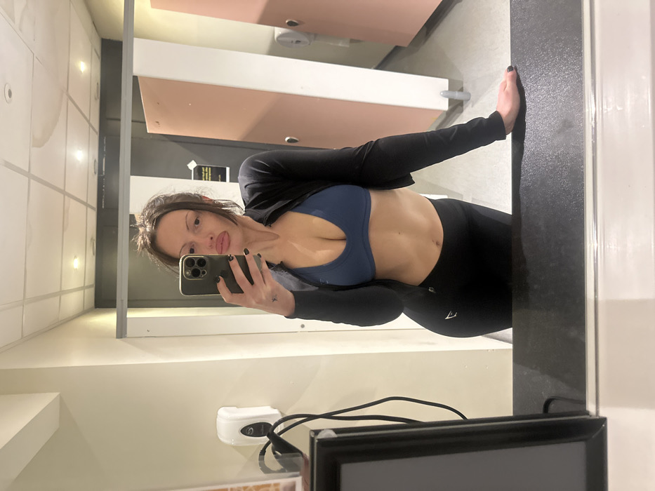 A woman in gym attire poses for a mirror selfie