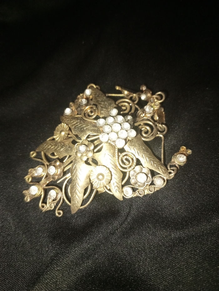 The image displays an ornate, aged metallic object, identified as being in Tagtse Tashidingkha, Bhutan. The object, appearing to be a brooch or buckle, is crafted from a dull gold-tone or tarnished brass-like metal, featuring a complex floral and foliate design. A central cluster of approximately 14-15 clear, round, faceted stones forms a grape-like pattern. Surrounding this central cluster are stylized leaves with visible veining, smaller daisy-shaped elements, and intricate scrollwork and tendrils. Additional clear, round, faceted stones are embedded throughout these decorative components. The metal exhibits an aged patina, and several small stones are missing from various points within the design, particularly along the edges. The object rests on a dark, subtly textured fabric surface, likely black, under direct illumination from an upper-left source, which creates bright reflections on the remaining stones and subtle highlights on the metalwork. No people, actions, or interactions are present.