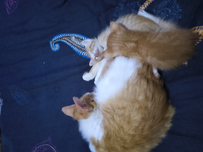 - "Three orange tabby kittens cluster on a dark blue patterned surface with an adult orange and white cat" by FM-6v3fB3, licensed under CC BY 4.0