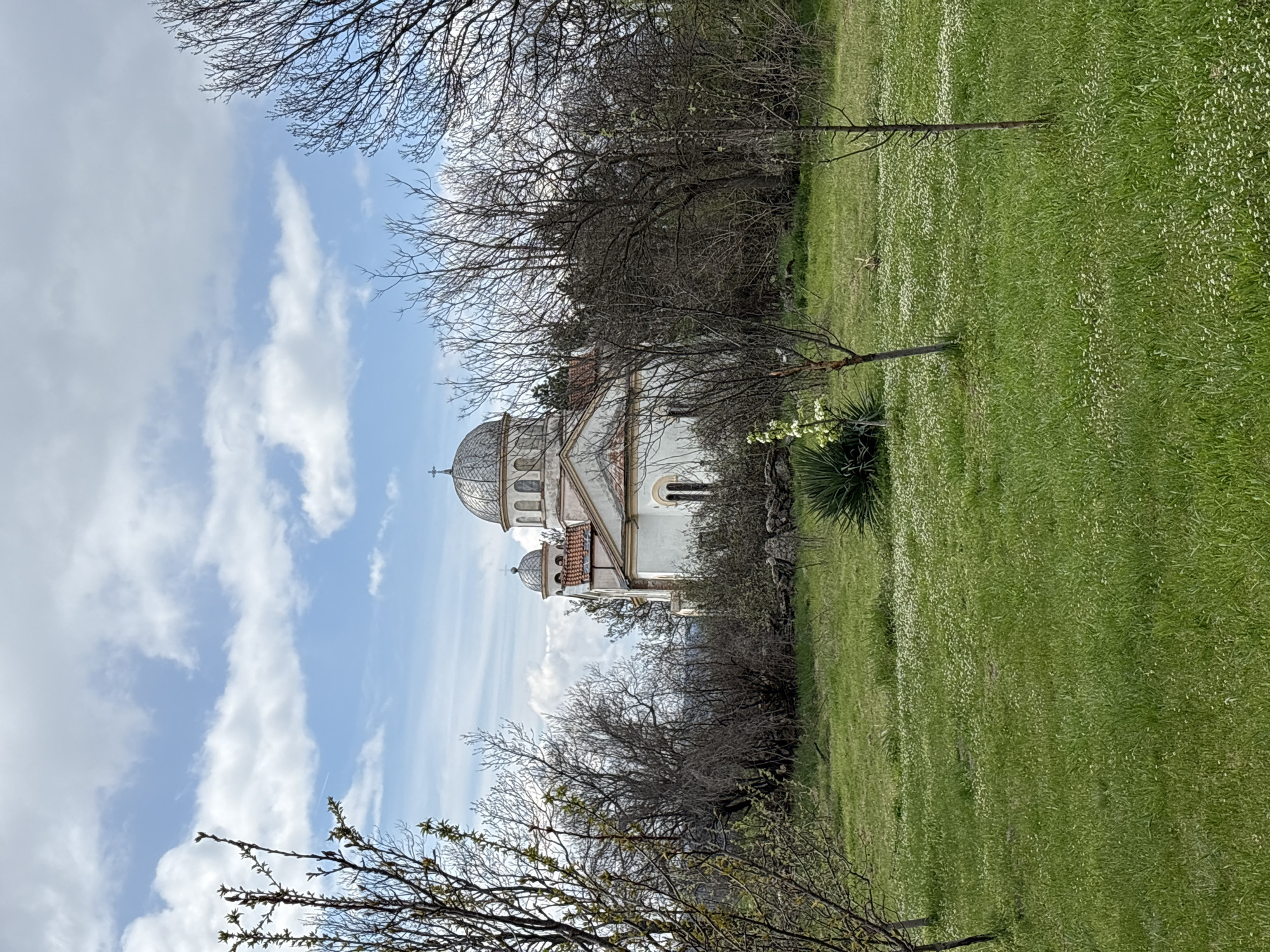white Orthodox church with two domes in Rabrovo, Bulgaria. The domes are gray with a black cross on top. The church is surrounded by green grass with small white flowers. Some bare trees are in the foreground and the background. The sky is light blue with white clouds. The perspective is slightly tilted.