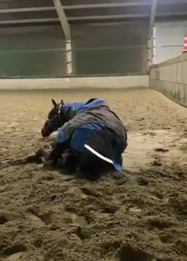 - "Inside an indoor arena with a sand surface, a dark-colored horse wearing a blanket is lying down and rolling around" by FM-xTDQG2, licensed under CC BY 4.0