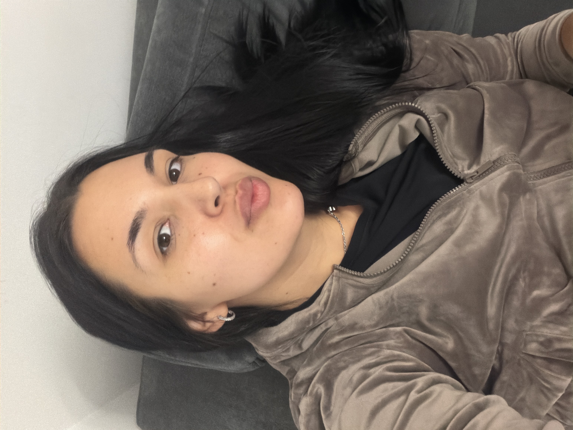 A young adult female, estimated to be in her 20s or 30s, is depicted in a medium-close-up shot, looking directly at the camera with her lips pursed