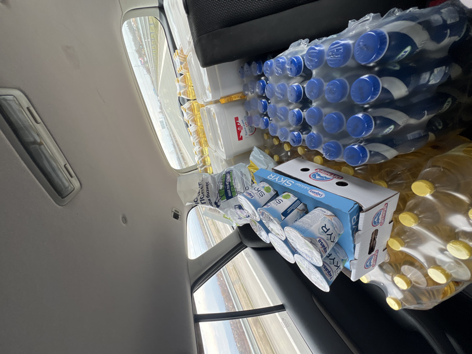 The image displays the interior of a moving vehicle, specifically the rear passenger compartment and cargo area, which are fully occupied by various bulk grocery items