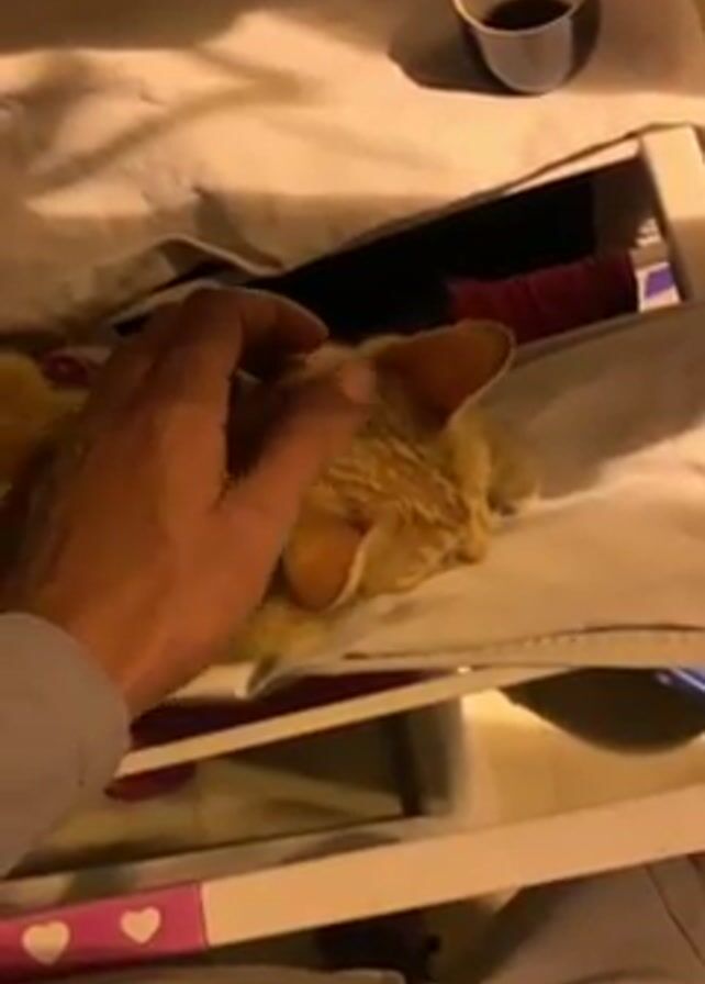 A tan cat is lying on a tan piece of fabric on what looks like a chair. A hand is petting the cat. There is a cup or mug next to the cat on the fabric.