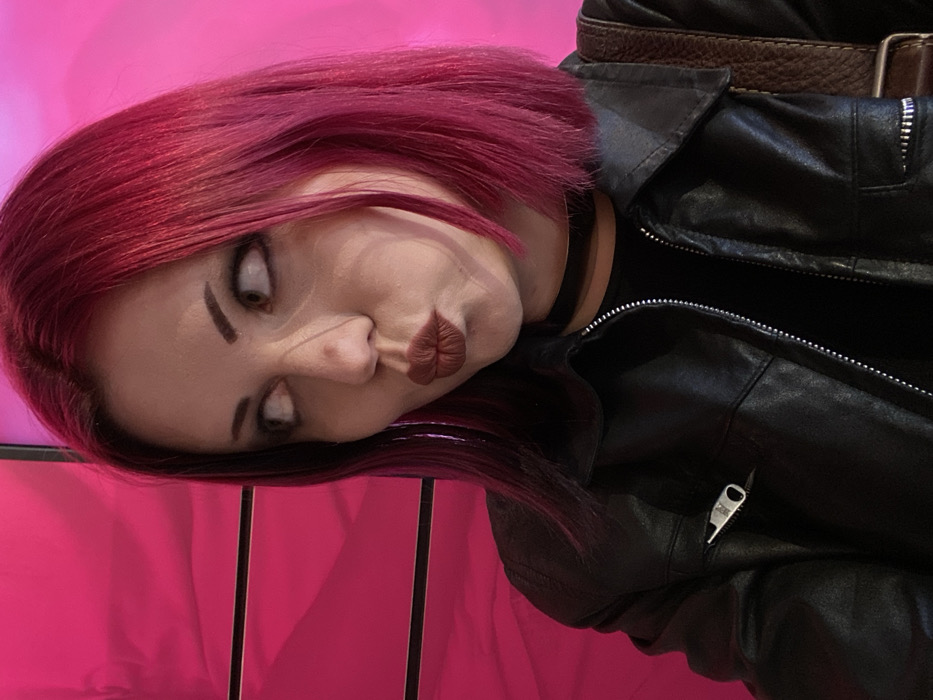 A female individual is depicted in a close-up portrait, framed from the chest up, against a vibrant magenta-pink background featuring subtle horizontal dark lines. She has shoulder-length, bright magenta hair. Her complexion is light, and her eyes, lined with dark makeup, are directed towards the viewer's left. Her lips are pursed and coated in dark reddish-brown lipstick. She is wearing a black leather jacket with a visible silver zipper pull on a pocket, a black garment underneath, and a thin black choker necklace. A brown bag strap is visible over her right shoulder. The scene includes noticeable shadows on the subject's face from a light source to the right. The location is Bar, Montenegro.
