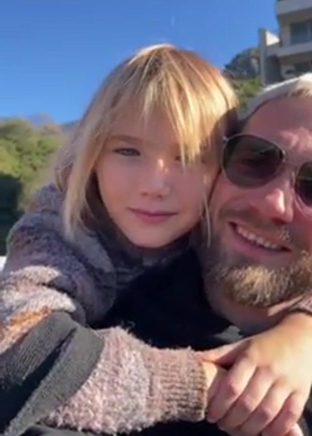 A man and a young girl are outdoors, likely taking a selfie. The man is holding the girl, who has blonde hair and is wearing a sweater. The man has a beard and is wearing sunglasses. The background shows a building, trees, and a clear blue sky. The man says, "Tell something." The girl replies, "Papa."