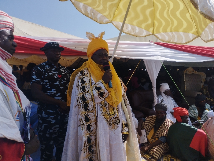 The scene is set in an outdoor gathering under a white canopy tent with red and white striped edges, situated in the town of Chum, Nigeria