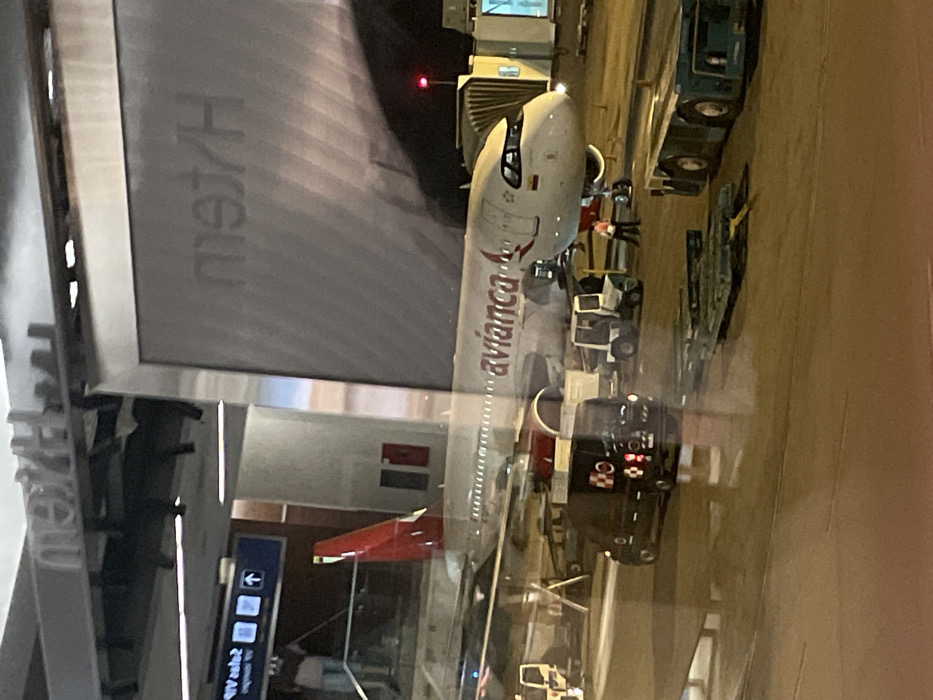 An Avianca airplane sits at an airport gate with support vehicles around it. The gate number is "H". An airport directional sign with white symbols on a blue background is visible. Reflected on the window are architectural elements of the airport.