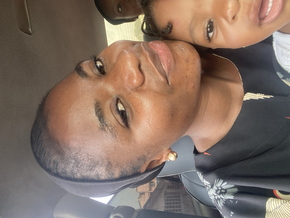A close-up shot reveals a woman with smooth, brown skin and dark eyes. She wears a black head wrap and a black blouse with a white floral pattern. A gold stud earring adorns her ear. Partially visible beside her is a child with brown skin and braided hair. The child's eye is visible, and a glimpse of their mouth shows teeth. They appear to be next to the woman's face. The photo is taken from inside a vehicle, with a window partially visible in the background.
