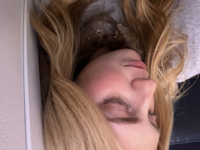 The scene depicts an interior location in Pudong, China. A young adult female with long, wavy, light blonde hair occupies the majority of the frame, presented in a close-up, angled view. Her head is tilted forward and slightly to the right, resting against a light-colored, vertical panel. Her eyes are closed or heavily downcast, with prominent dark eyelashes visible. Her lips are gently pursed, and her light skin shows a pinkish blush on her left cheek. She is wearing a light grey hooded sweatshirt, with the fabric texture and metallic eyelets on the collar visible. To the left, a dark, indistinct surface is visible in the background, possibly a seat. To the right, the light-colored, vertical panel against which she rests shows a subtle textured surface and a distinct white vertical seam. The lighting is soft and diffused, indicating an interior setting, likely a confined space such as an aircraft or vehicle cabin.