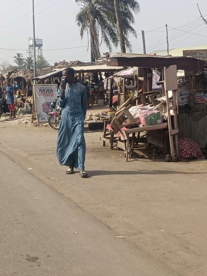 The image depicts an outdoor market street scene in Alizaga, Nigeria, under clear daylight conditions. In the foreground, an asphalt road transitions into a dirt and gravel shoulder on the right. A dark-skinned male in a light blue long-sleeved traditional garment and light-colored sandals walks from left to right across the frame. His right hand is raised towards his face, possibly holding a phone or gesturing. Behind him, a "WADADA GOVERNOR" political campaign sign, featuring a male portrait, stands next to a red motorcycle. The background features numerous makeshift market stalls constructed from wood, corrugated metal, and tarps, lining both sides of the street. These stalls display various goods, with one prominent stall in the mid-right exhibiting packaged items in pink and green. Several indistinct figures are visible among the stalls, engaged in market activities. A tall metal water tower structure is visible in the far left background, and several palm trees punctuate the skyline. The ground is scattered with minor debris.