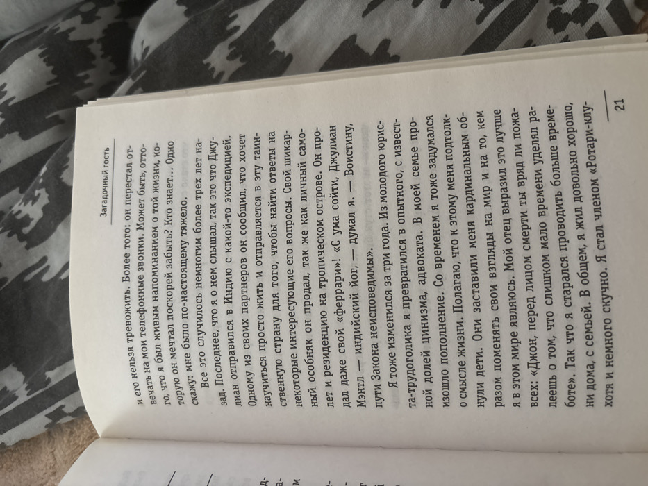 The image displays an open paperback book resting on a grey-tone camouflage patterned fabric surface in Baku City, Azerbaijan. The visible right page, numbered '21' at the lower right corner, presents black Cyrillic text on an off-white background. A heading, "Загадочный гость" (Mysterious Guest), is printed at the top right of this page. The camouflage pattern comprises irregular shapes in varying shades of grey, black, and white. No individuals or dynamic actions are depicted.