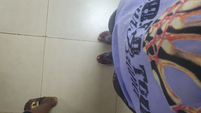 The image captures a downward-facing, first-person perspective within an indoor environment, located in Unknown, Unknown. The floor consists of light-colored, possibly off-white or beige, square ceramic tiles with dark, visible grout lines, some of which exhibit minor cracks or imperfections. In the foreground, the lower torso and legs of one individual are visible. This person is wearing a light purple t-shirt with black lettering, partially legible as "OUR TOUR," and a graphic design depicting yellow and orange organic or skeletal structures interwoven with red, web-like patterns. Below the t-shirt, dark-colored lower garments are partially visible. The individual's feet, exhibiting a dark skin tone, are clad in brown flip-flops with light grey straps and are positioned flat on the tiled floor. In the upper left portion of the frame, the left foot of a second individual is partially visible. This foot, also with a dark skin tone, is wearing a dark-colored sandal adorned with a prominent gold-toned metallic buckle or embellishment on its strap. Both individuals appear to be standing still. No other subjects, objects, actions, or interactions are discernible beyond their presence in the shared tiled space. The lighting is consistent throughout the visible area, indicative of interior illumination.
