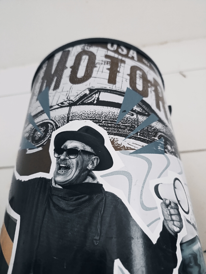 A cylindrical container displays a collage. The top section features the word "MOTOR" and a vintage car illustration, overlaid with grey-blue geometric shapes. Below, a black-and-white image depicts a man in a hat and sunglasses, shouting and holding a megaphone. The man is positioned in front of a white wavy pattern. The background appears to be a white wooden surface.