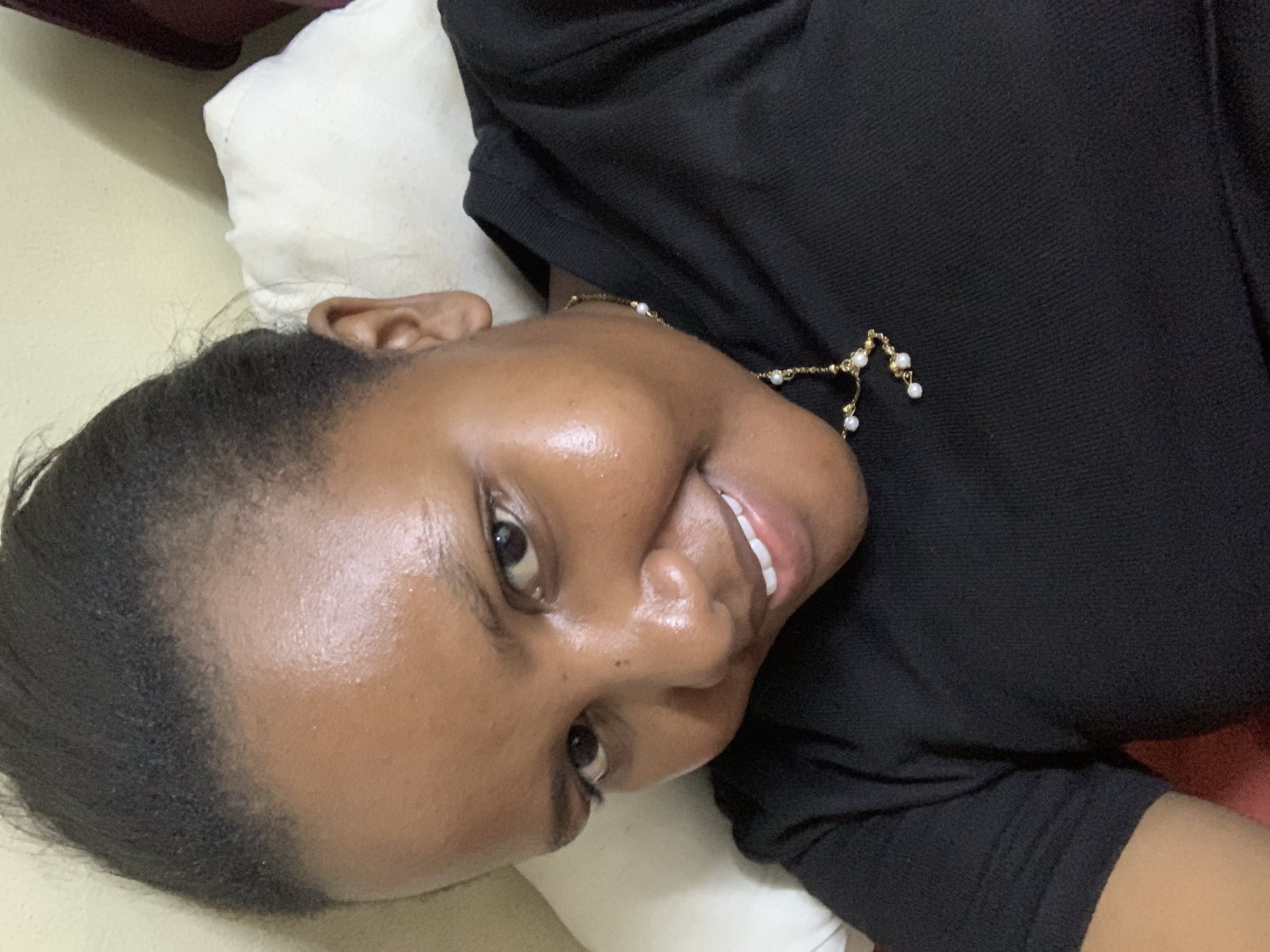 A woman with dark skin and black hair is lying down on a white pillow. She is wearing a black shirt and a gold necklace with small pearls. The woman is smiling and looking at the camera. The location is not identifiable as Dar es-Salaam, Tanzania.