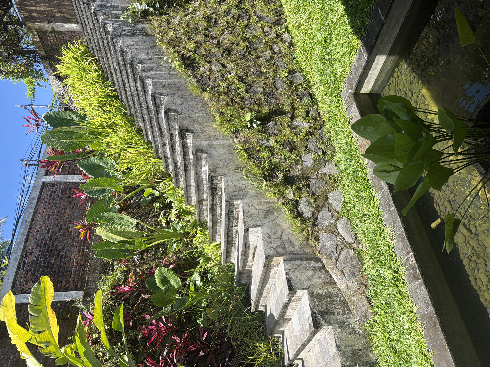 The image captures a vertical shot of a stone stairway in what appears to be Petulu, Indonesia, based on the surrounding vegetation and architectural style. The stairway, constructed of gray stone, ascends from the lower right towards the upper left of the frame. The steps are flanked by lush greenery, including various types of plants, moss-covered stone walls, and grass. On the left side of the stairs, there is a brick building partially visible, with tropical plants climbing up the wall. The sky is blue with some scattered trees in the corner. To the right of the stairway, a narrow stone-lined water feature with aquatic plants adds to the tropical landscape. The water is clear, and the bottom is covered with small stones.