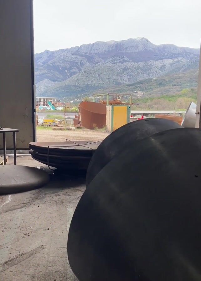 From inside a large industrial building, a view looks out through a wide opening onto a construction yard. Several large pieces of rounded metal sit on the concrete floor in the foreground. Just outside the opening, there is a stack of large bowl-shaped metal structures. Outside in the yard, other metal structures are visible, along with a small yellow building and construction vehicles. In the distance, a range of large, rocky mountains forms the backdrop. The sky is overcast.