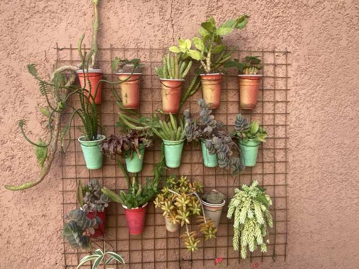 The scene is located in Barden Yana, Nigeria. An outdoor vertical garden is displayed against a textured, light reddish-brown stucco wall. A rectangular grid constructed from dark, thin wire serves as the support structure, mounted flush against the wall. A total of seventeen individual plants, primarily succulents and cacti, are arranged within various colored plastic cups serving as planters, which are affixed to the wire grid. In the upper section, five plants are housed in orange and red cups. Below these, six plants are contained within light green cups, with one notable plant featuring dark reddish-purple foliage. In the lower section, another six plants are visible, utilizing a mix of red, off-white, and green cups. Plant types include trailing succulents, upright cacti, and various leafy succulents. One large, winding cactus-like plant extends vertically up the left side of the grid, with some branches growing outward. A prominent burro's tail succulent with dense, light green leaves hangs downwards from an off-white cup in the lower right. Small pink flowers are visible near the bottom of the grid, possibly growing from the ground or a low planter. No individuals are present in the image.