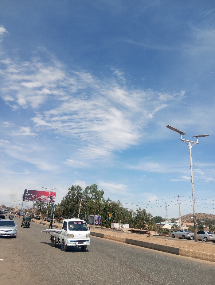- "The scene depicts an outdoor, sunlit, multi-lane asphalt road in Unknown, Nigeria, under a bright blue sky with scattered white cirrus and stratocumulus clouds" by FM-KfFx13, licensed under CC BY 4.0