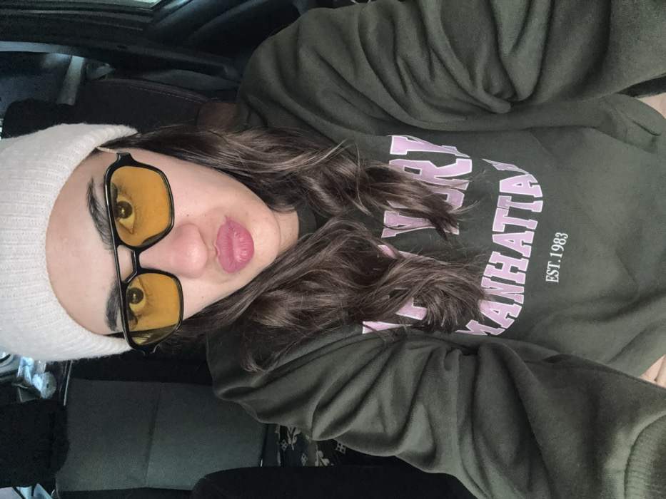 An adult female is depicted in a chest-up, front-facing image, likely a selfie, taken inside a vehicle. She wears a white ribbed knit beanie and black-framed glasses with yellow-tinted lenses. Her long, wavy dark brown hair is visible beneath the beanie. Her eyebrows are dark and prominent, and her lips are pursed, covered with a pink lip product. She is wearing an olive green long-sleeved crewneck sweatshirt featuring the words "NEW YORK" and "MANHATTAN" in light pink block letters, with "EST. 1983" printed below in smaller text. The background consists of dark-colored interior elements of a vehicle, including what appears to be a seat or seat back to her left, upholstered in a dark fabric with a subtle pattern visible on a lower section, and generic dark vehicle interior components to her right. No visual identifiers within the image directly support a specific location in Meknes, Morocco, or any other city.